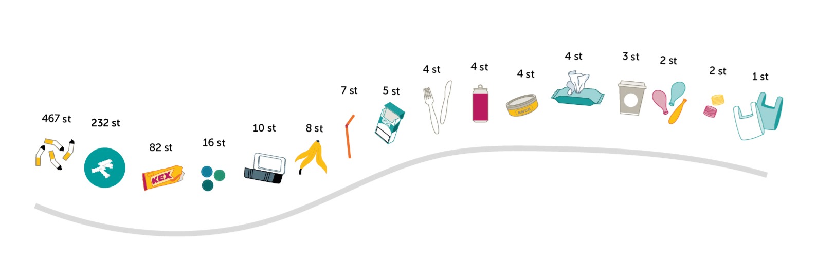 Under promenaden skulle du bland annat gå förbi 467 fimpar, 232 snusprillor, 82 mjuka omslag från till exempel godis och snacks, 16 kapsyler eller lock och 10 matförpackningar.