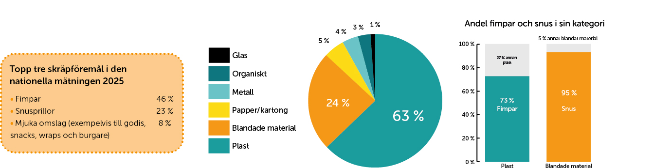Det näst vanligaste skräpet är snus som står för 23 % av allt skräp. Tillsammans med andra nikotinrelaterade föremål – som snusdosor, cigarettpaket och vejps – utgör nikotinskräpet cirka 70 % av allt skräp som hittas i stadsmiljö.