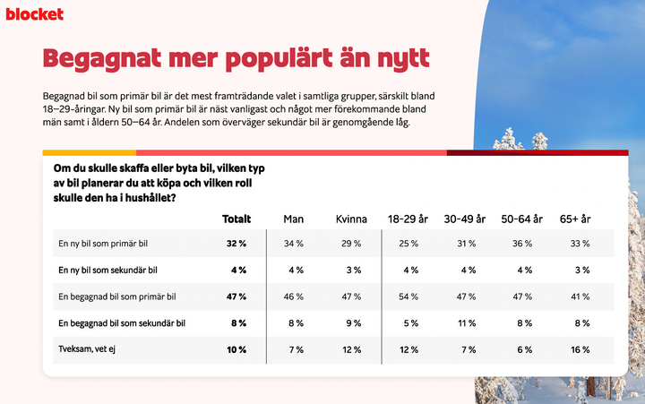 Samtidigt dominerar begagnatmarknaden, där hela 47 procent väljer begagnat som förstahandsval inför kommande bilköp. Motsvarande siffra bland dem som föredrar nyköp är 32 procent.