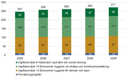 Under 2026 väntas utgifterna för socialförsäkringen öka med ungefär 11 miljarder kronor och landa på totalt 258 miljarder kronor, vilket motsvarar 16,9 procent av statens samlade utgifter. Under 2026 väntas ökningen bli större än vanligt, främst på grund av regeländringar inom tandvårdsersättningen.