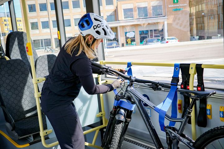 Cykeln tas med ombord och spänns fast på bussens flexyta. Varje buss kan ta med högst två cyklar åt gången. Flexytan är i första hand till för resenärer med exempelvis barnvagn, rullator eller rullstol. Det innebär att cyklar inte har företräde, utan får tas med i mån av plats.