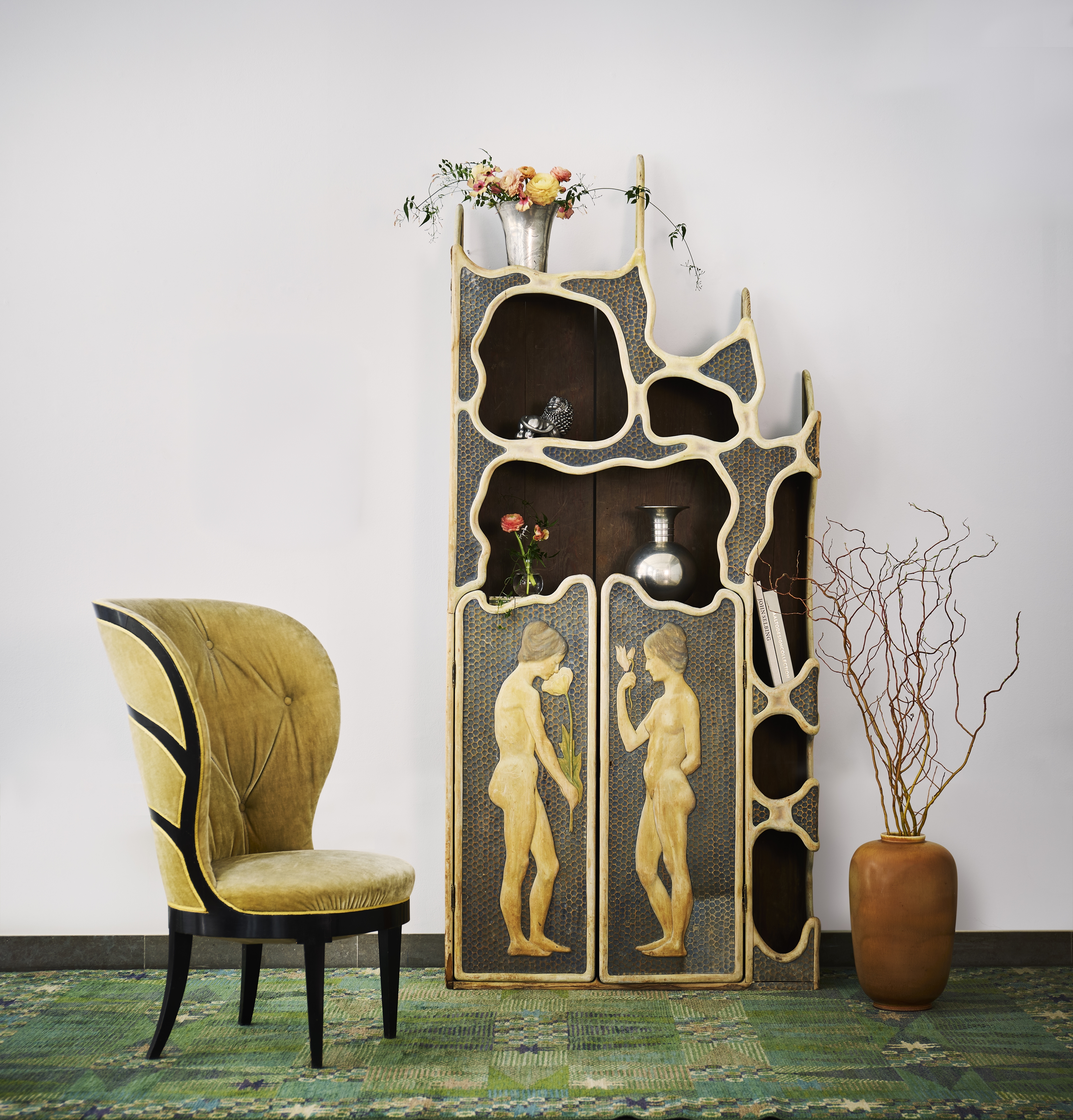 Miljöbild med Uno Åhréns Swedish Grace-fåtölj och Valentin Kiellands jugendskåp, som båda satte rekord på Stockholms Auktionsverks slagauktion The Design Sale.