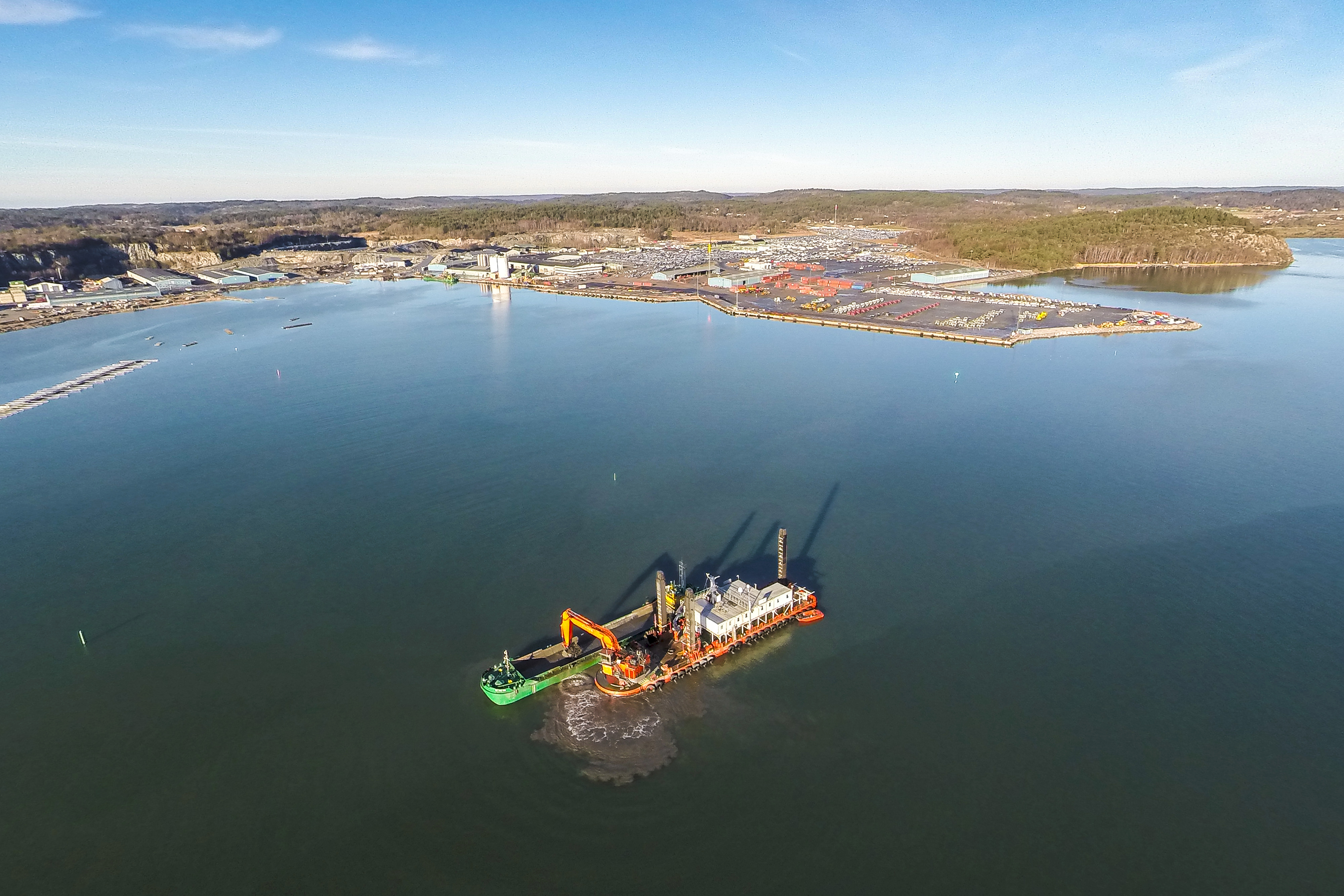 - Totalt har en yta av 450 000 kvadratmeter muddrats. 450 000 kubikmeter jord och berg har flyttats och utgör nu en utfyllnad på land, som med tiden kommer att kunna användas för exempelvis uppställning av gods och bilar.