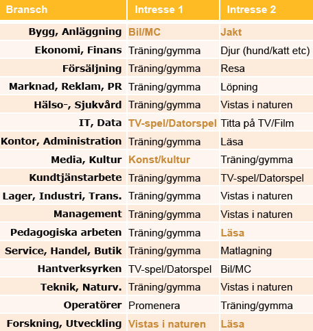 Vad har vi egentligen för fritidsintresse? Träning och gymma är de överlägset vanligaste fritidsintressena. Intressen för bilar och motorcyklar hittar vi i första hand bland hantverksyrken och bygg/anläggning medan forskaren gärna vistas i naturen och läser på sin fritid.