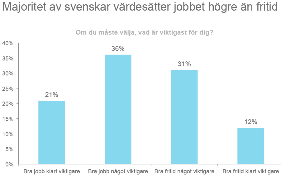 En majoritet av svenskarna värdesätter jobbet högre än sin fritid. Men att det finns en tydlig positiv koppling mellan fritidsintresset och jobbprestationen, kanske är en förklaring till att så många av oss har en fritidssysselsättning som vi ägnar oss åt flera gånger i veckan. Ägnar du dig åt löpning, ridning, cykling eller gymträning, eller om du prioriterar att vistas ute i naturen, ser du störst nytta av din hobby på arbetet.