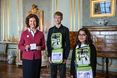 H M Drottning Silvia är Majblommans högsta beskyddare, och fick redan i måndags möjlighet att köpa årets allra första majblommor. 10-åriga Lia Sorani och 12-årige David Netz från Barkarby skola gästade då Stockholms slott.
