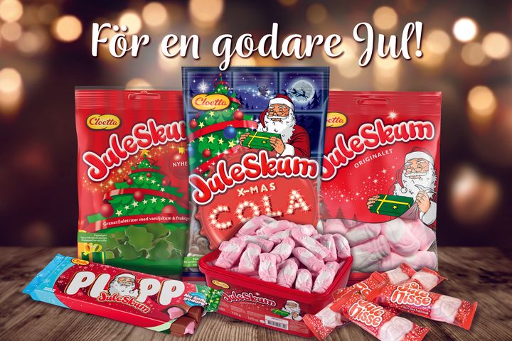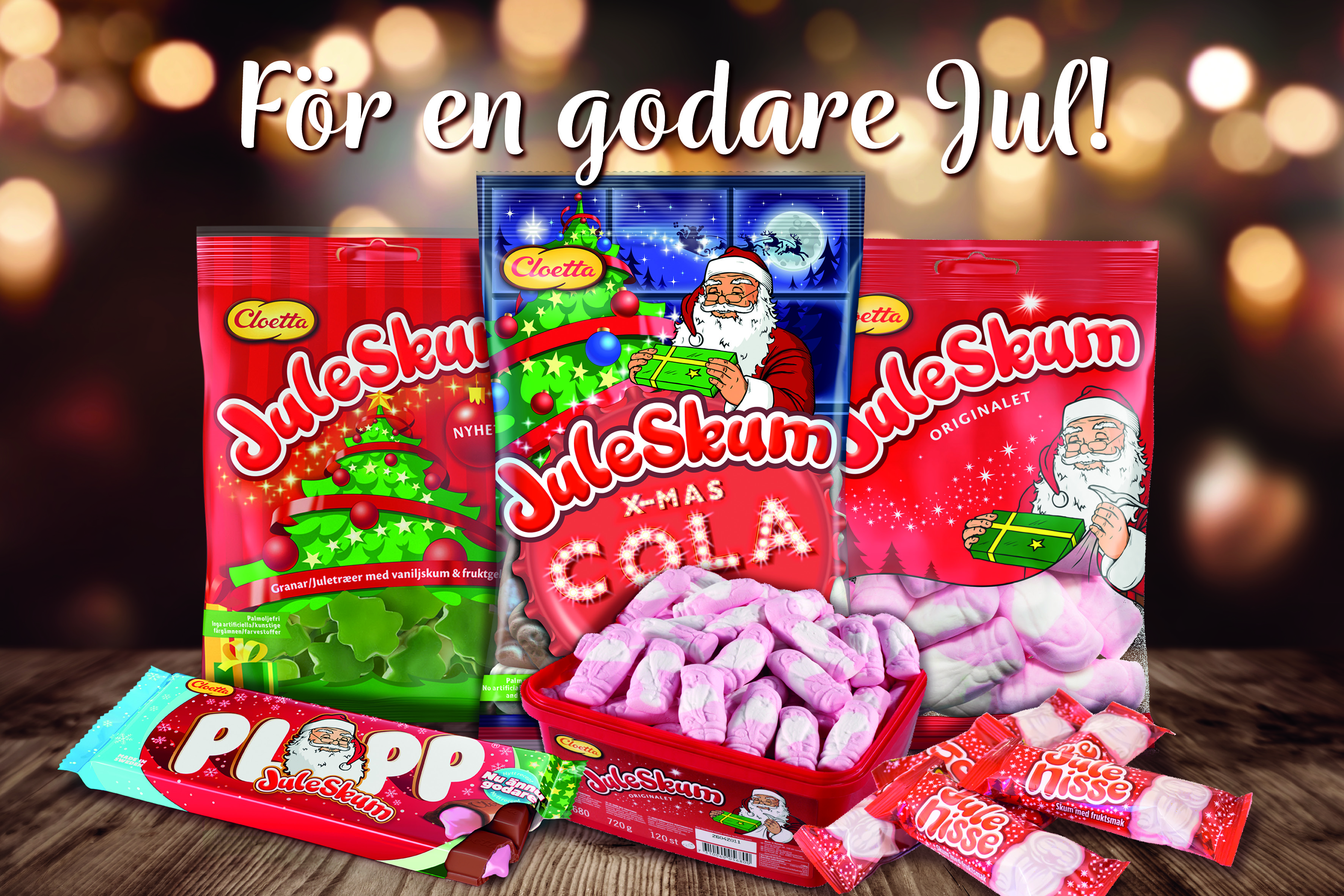 Förutom ”original-tomten” erbjuder Cloetta Juleskum även Juleskum Granar med en kombination av vaniljskum och härlig fruktgelé. Vill du ha en munsbit i farten är Julenissen perfekt - en extra stor skumtomte som ger en rejäl portion julstämning.