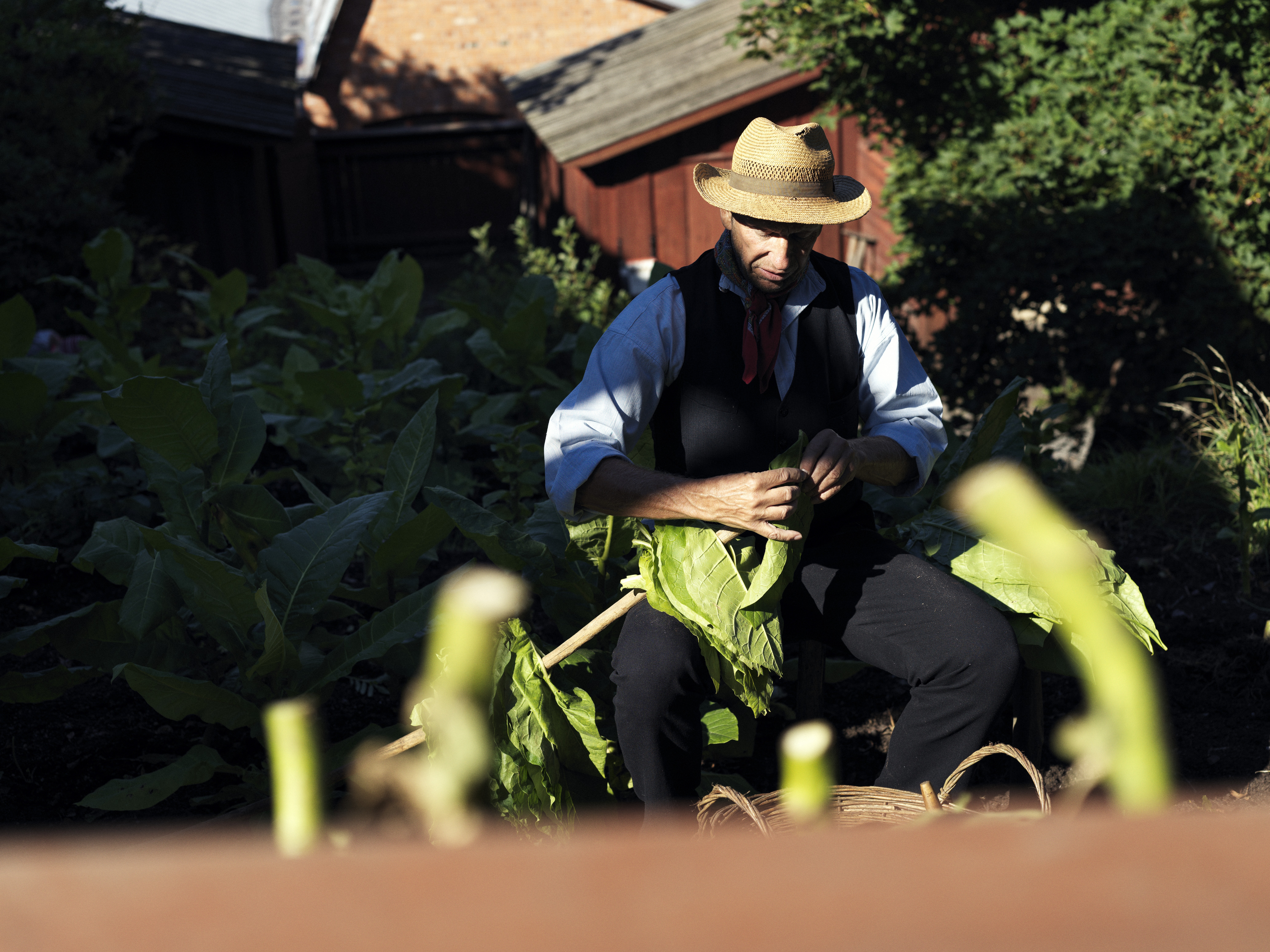 Skörd av tobak på Garverigården på Skansen.