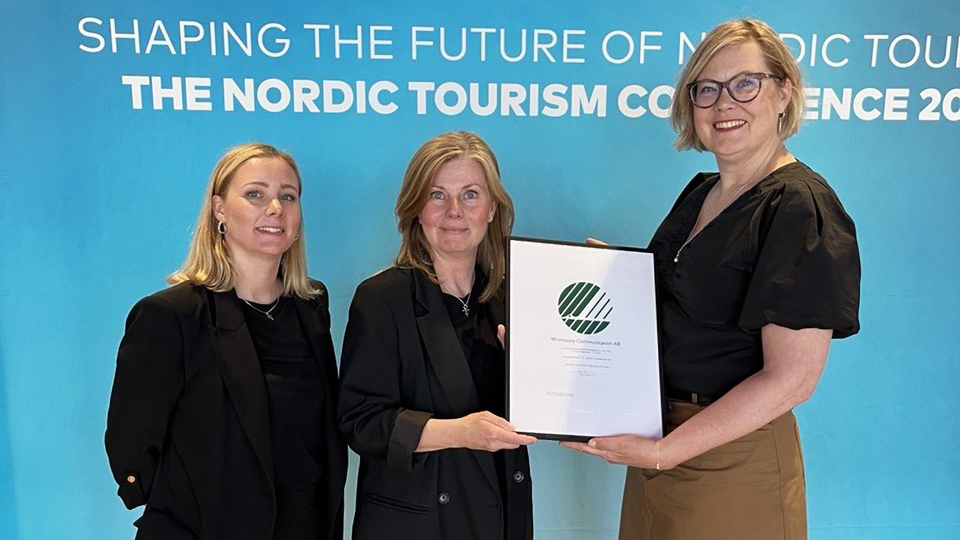 Grattis till Minnesota Communication, först i världen med ett Svanenmärkt event! Från vänster: Sofie Lagergren, Minnesota Communication, Helena Österberg, Minnesota Communication, Sara Bergman, Miljömärkning Sverige.