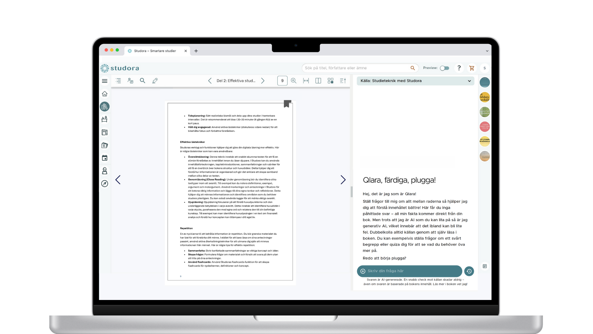 Studora är en smart studieplattform med kurslitteratur och studieverktyg som hjälper studenter att klara sina studier. På Studora kan studenterna läsa sin kurslitteratur digitalt, anteckna i och utanför e-boken, skapa flashcards och förstärka inlärningen genom bland annat kapitelsammanfattningar, poddar och videos. Dessutom har plattformen ett eget AI-verktyg – Qlara – som gör det möjligt för studenter att ställa frågor och resonera direkt i e-boken, med bara kursboken som källa. Här samlas allt på ett ställe och studenter kan plugga enkelt och bekvämt, oavsett vilken enhet som används. Läs mer på studora.se.