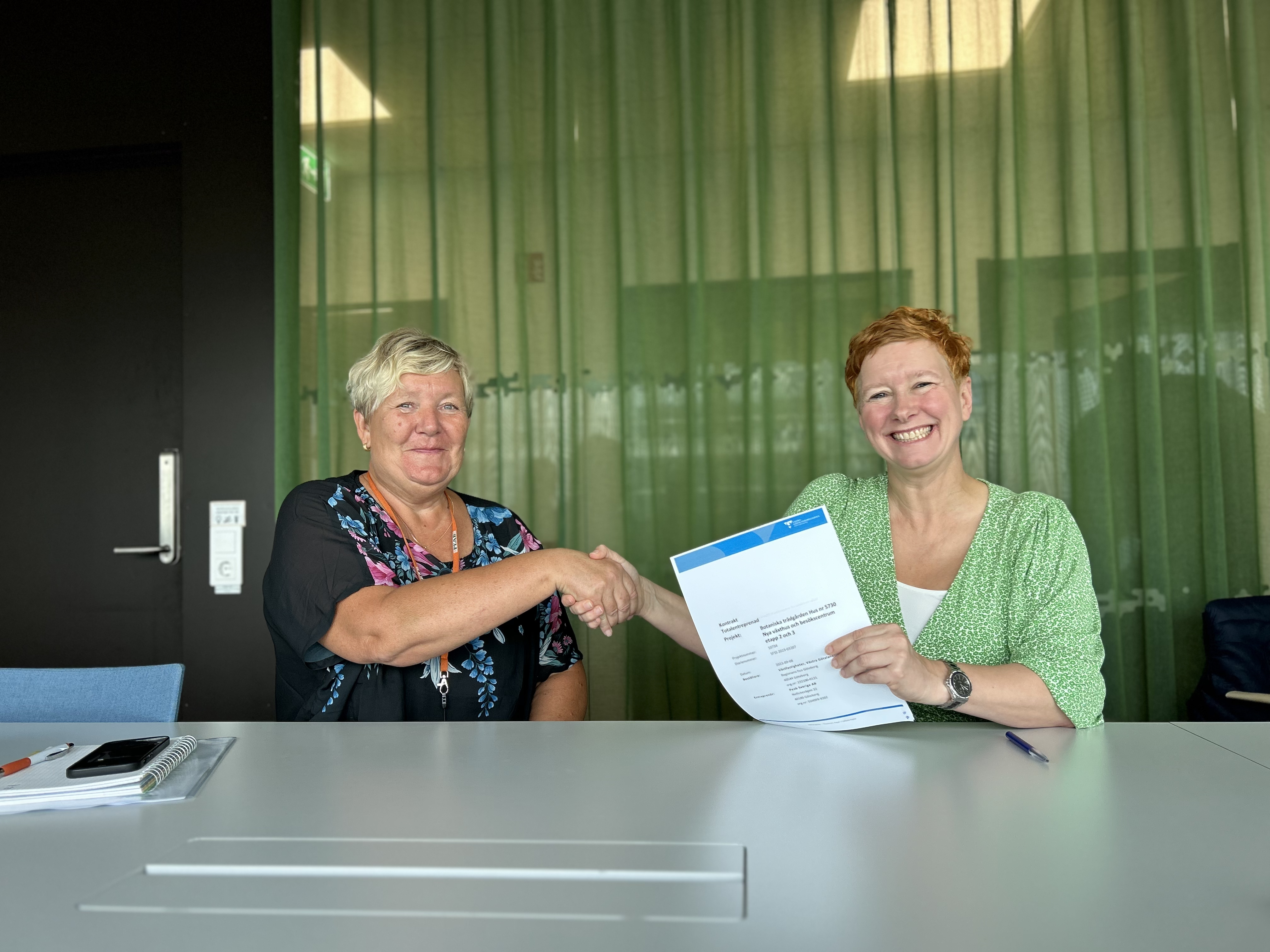 Liselott Bergkvist, regionchef på Peab och Ior Berglund, förvaltningschef Västra Götalandsregionen skriver under kontrakt.