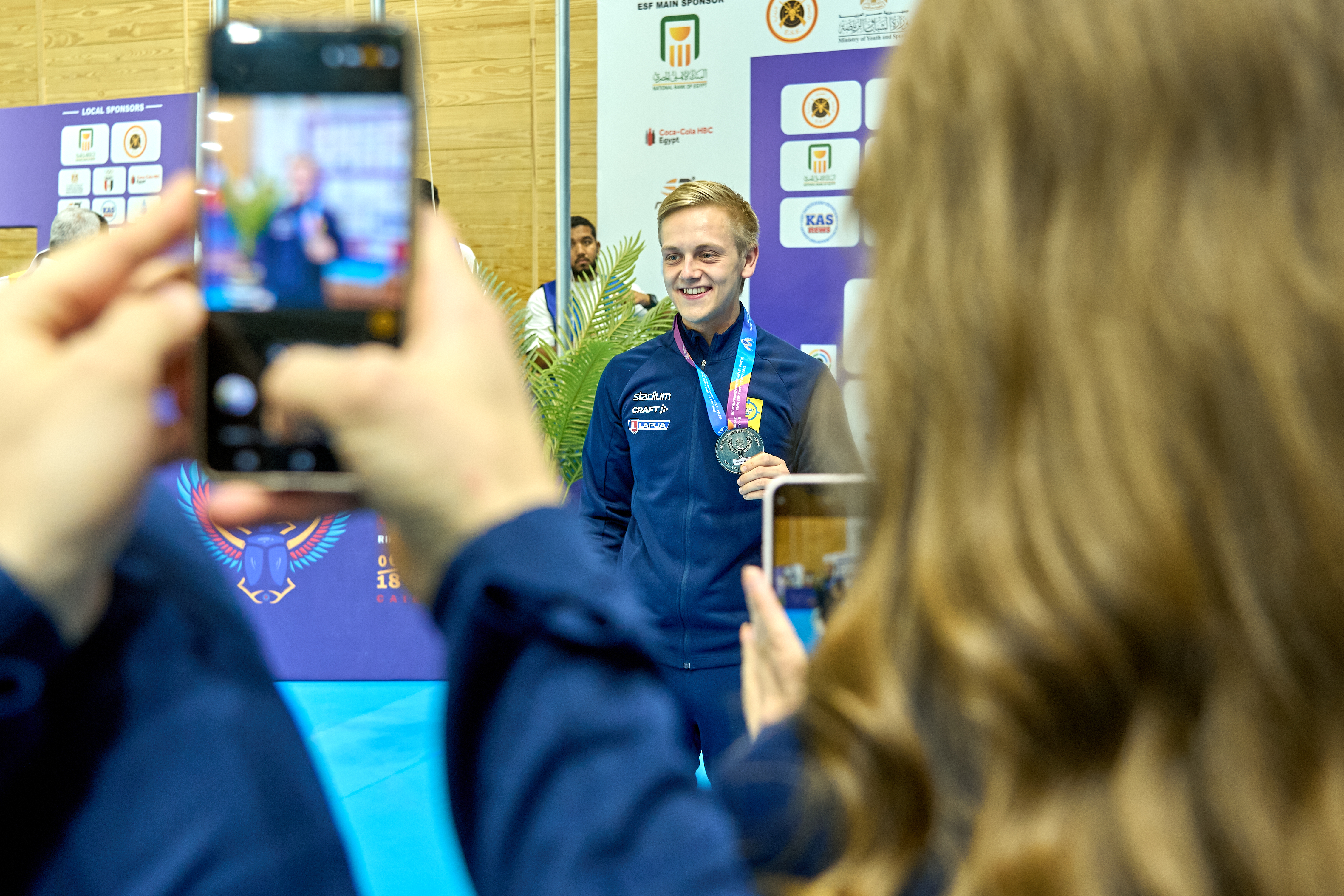 Victor Lindgren kliver av pallen med sitt VM-silver, efter en rafflande final där guldet gled honom ur händerna i sista skottet.