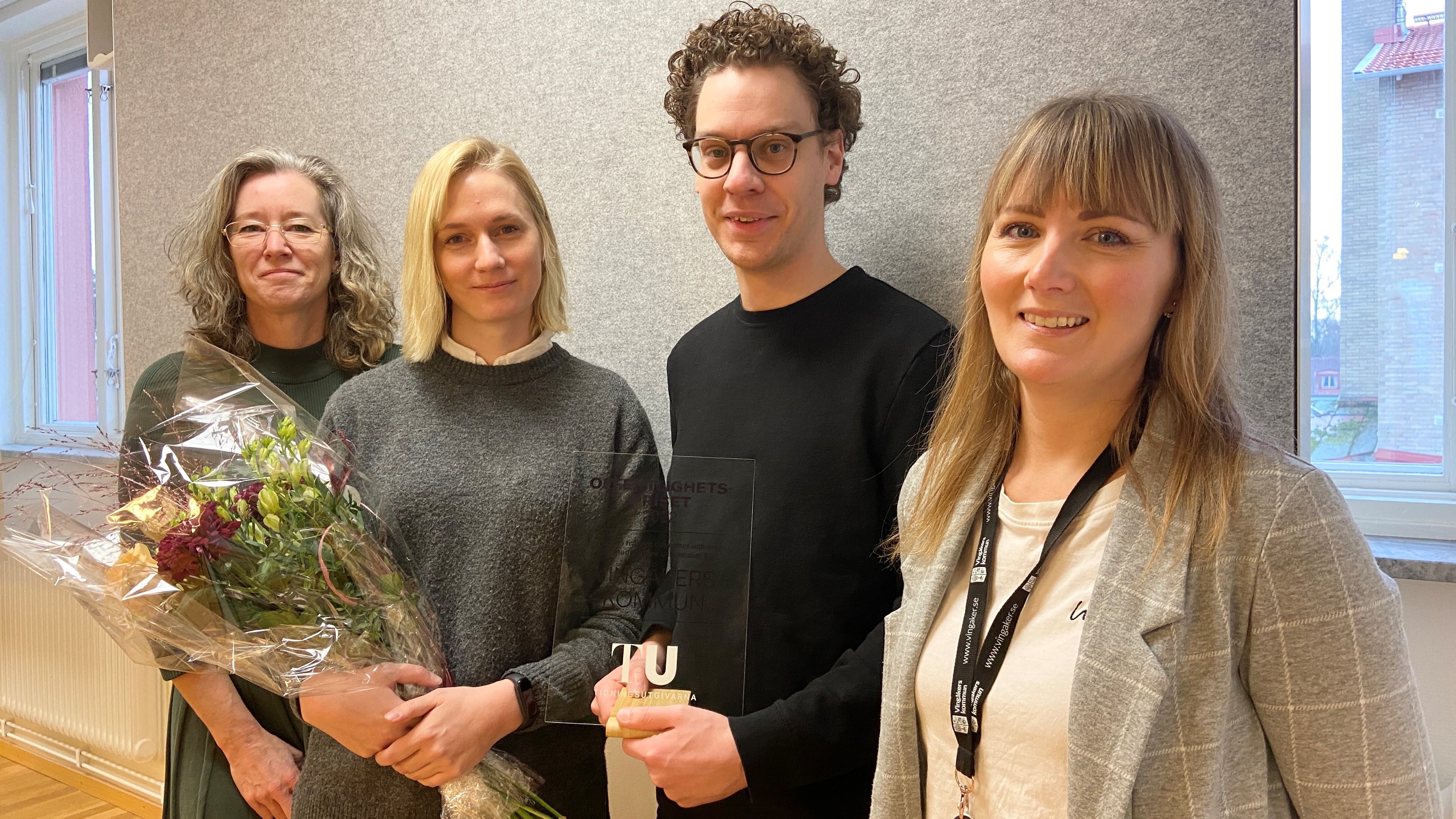 Vingåkers kommuns kommunikationschef Maria Pestrea, Marlene Mård, gruppledare för nämndservice, samt kommunikatörerna Niclas Bredenberg och Emma Carstinge är glada och stolta över att kommunen tilldelats Offentlighetspriset 2022.